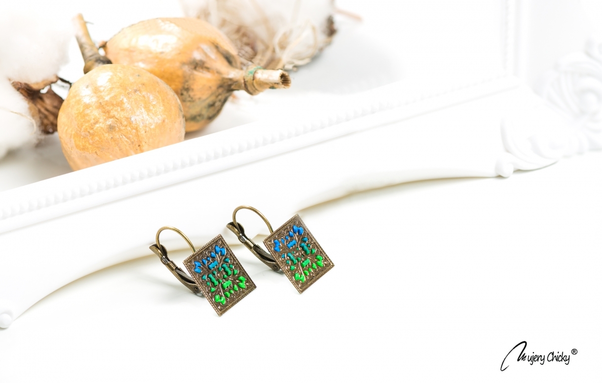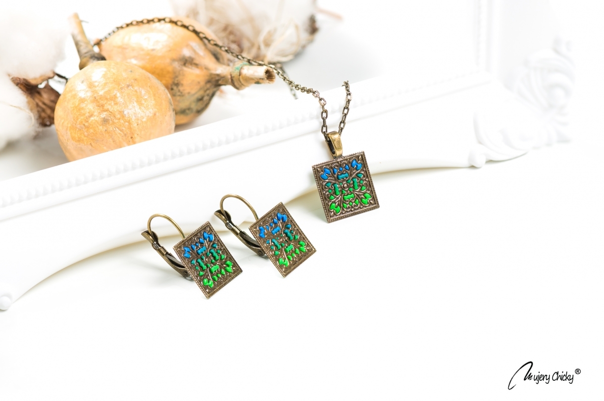 Setul cu cercei și pandantiv dreptunghiulare lucrate manual, este inspirat de culorile naturii. Păstreză pentru tine accesoriile sau oferă-le cadou unei persoane dragi!