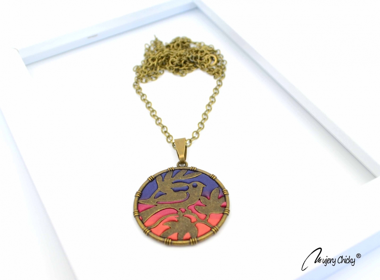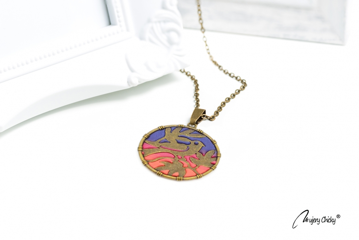 Colierul este confecționat manual prin tehnica applique, din lut polimeric în degrade, pe bază metalică cu finisaj bronz antic. Degradeul cromatic este realializat prin modelaj.