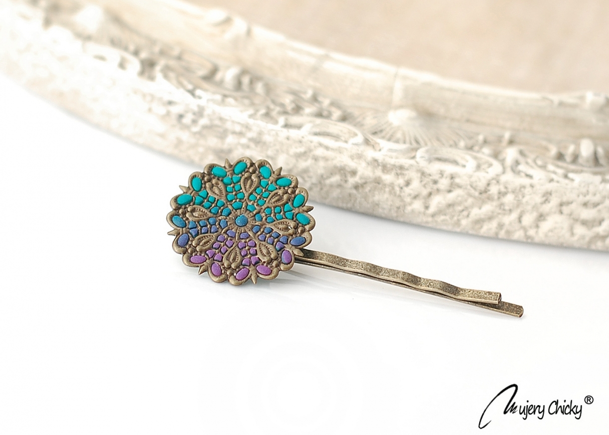 Agrafa Vintage este confecționată manual prin tehnica applique, din lut polimeric, pe bază metalică cu finisaj bronz antichizat. Degradeul cromatic este realizat prin modelaj.