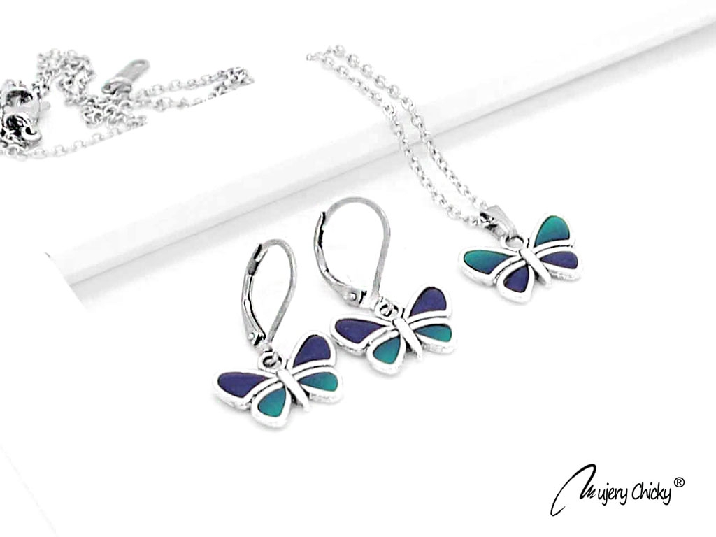Cerceii și colierul Wings of a Butterfly sunt confecționate manual prin tehnica applique, din lut polimeric, pe bază din oțel inoxidabil.