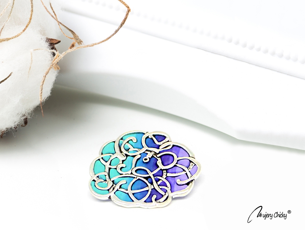 Broșa este confecționată manual prin tehnica applique, din lut polimeric, pe bază metalică cu finisaj argintiu.