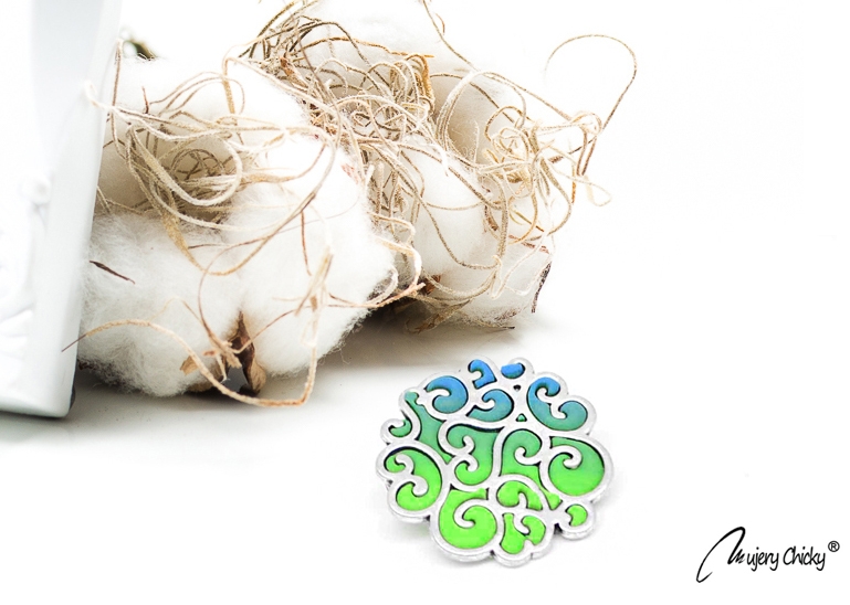 Broșa este confecționată manual prin tehnica applique, din lut polimeric, pe bază metalică cu finisaj argintiu.