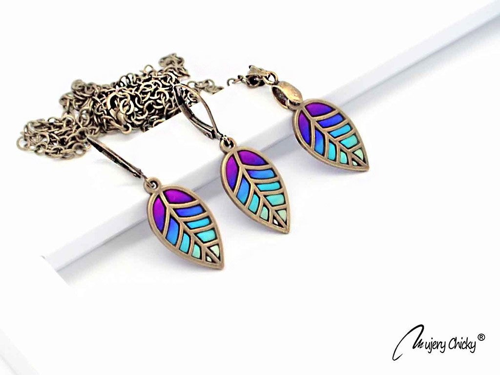 Setul Cercei și Colier Frunză Hope lucrate manual din lut polimeric prin tehnica applique, cu motive inspirate din natură te scot din anonimat.