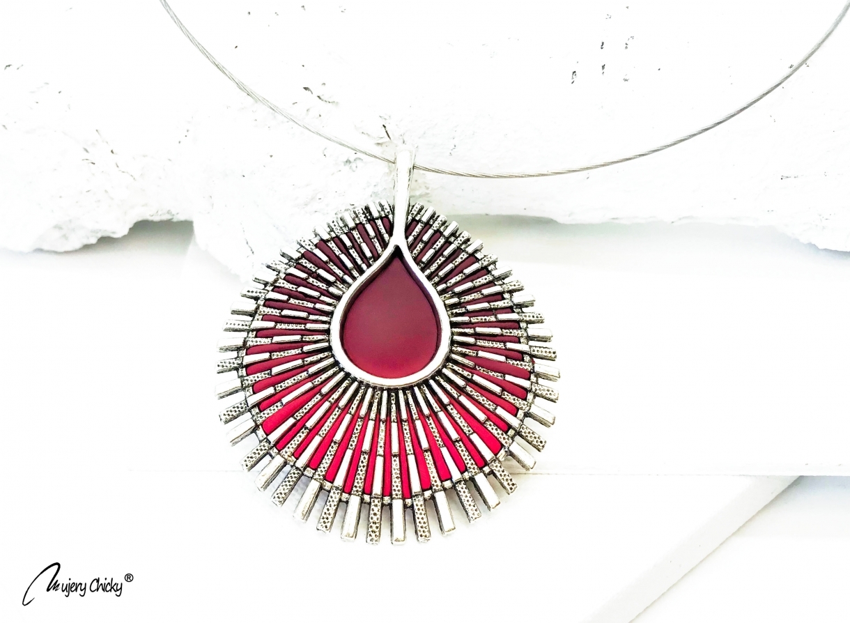 Colierul Radiant este confecționat manual prin tehnica applique, din lut polimeric în nuanțe de degrade, pe baza metalica argintie. Degradeul cromatic este realizat prin modelaj.