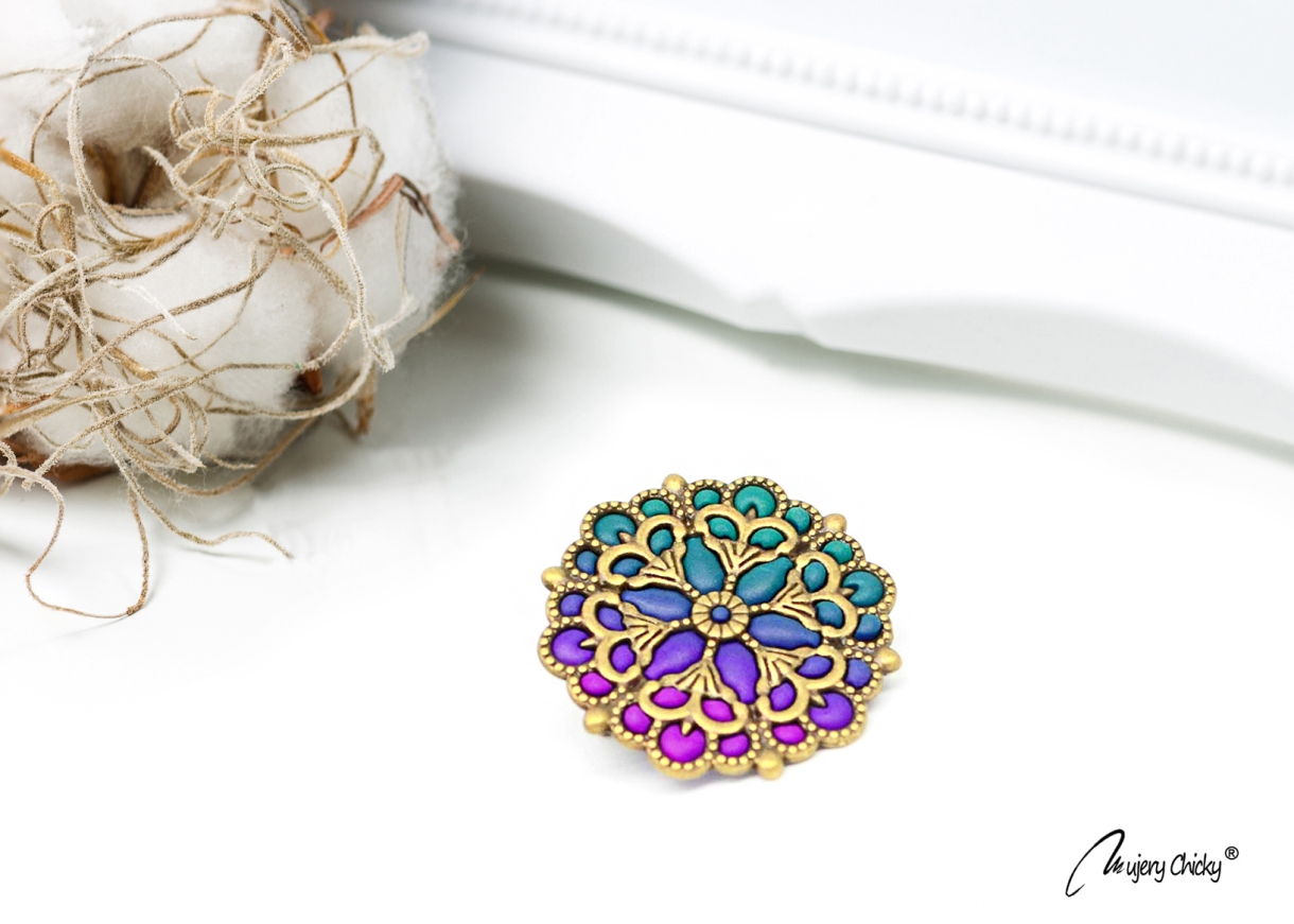 Broșa este confecționată manual prin tehnica applique, din lut polimeric, pe bază metalică cu finisaj bronz.