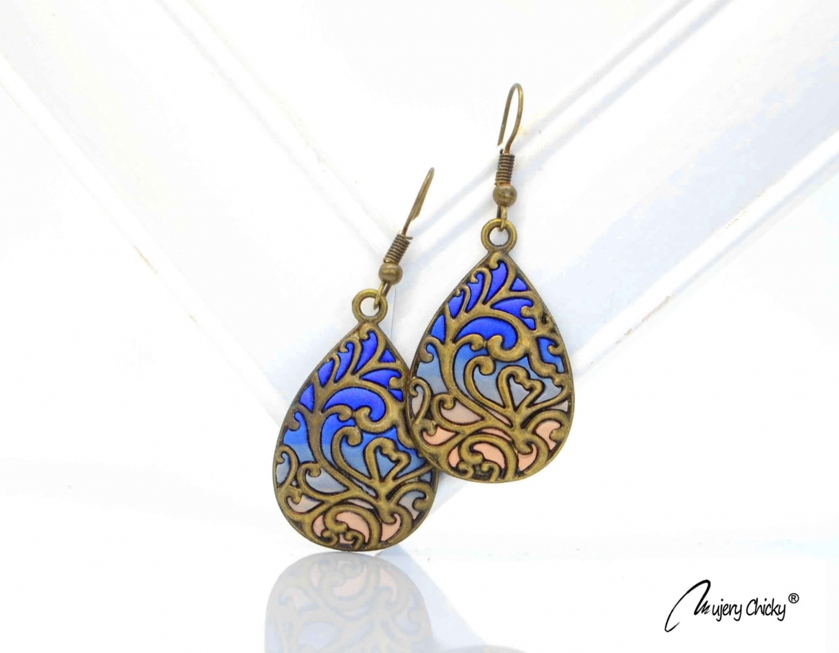 Cerceii Lumis - Pale Sunset în formă de lacrimă în stil vintage, lucrați manual prin tehnica applique, din lut polimeric, pe bază metalică cu finisaj bronz antichizat.