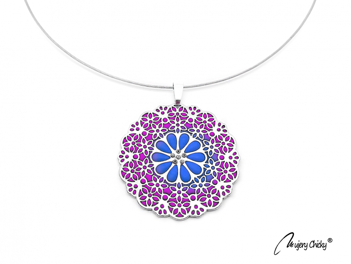 Colier Flower Power - Believe este confecționat manual prin tehnica applique, din lut polimeric în nuanțe de degrade, pe bază metalică argintie. Degradeul cromatic este realizat prin modelaj.