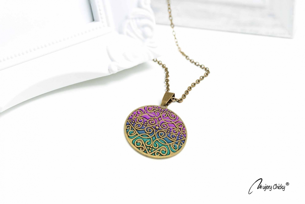 Colierul este confecționat manual prin tehnica applique, din lut polimeric în degrade, pe bază metalică cu finisaj bronz antic. Degradeul cromatic este realializat prin modelaj.