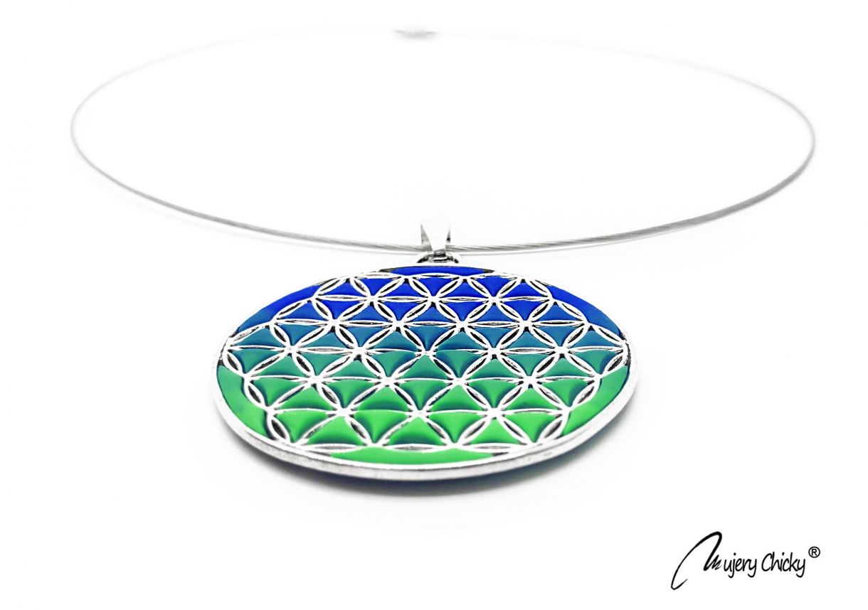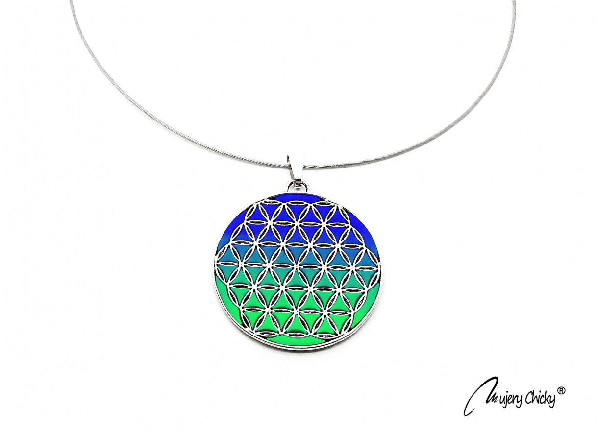 Colier Floarea vieții - Earth lucrat manual, prin tehnica applique. Poți purta acest simbol asupra ta, sub formă de bijuterie, are efecte puternice de vindecare asupra corpului fizic și psihic, te ajută să depășești fricile, să întâlnești oamenii potriviți, să te conectezi la sinele superior.