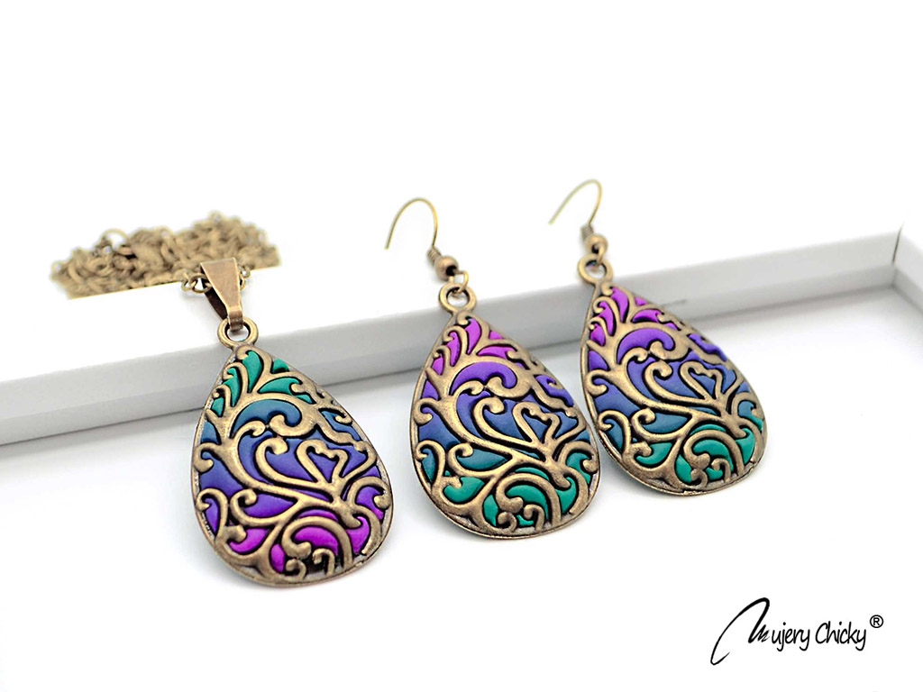 Setul Cercei și Colier Lumis lucrat manual din lut polimeric și bronz prin tehnica applique. Îl poți asorta cu ușurință la o cămașă albă și o pereche de jeansi, sau la o rochie simplă de seară.