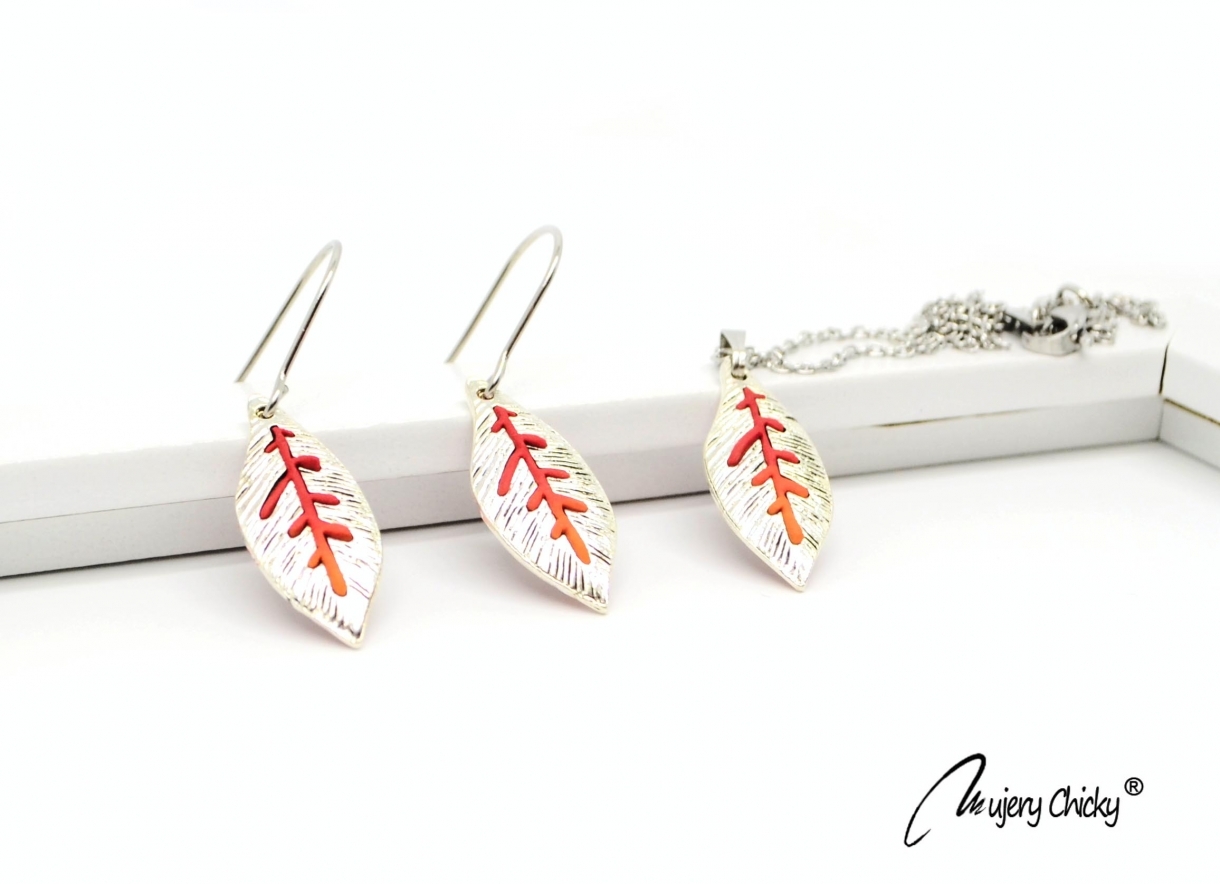 Cerceii și colierul Stylish Leaf sunt confecționate manual prin tehnica applique, din lut polimeric, pe bază din oțel inoxidabil.