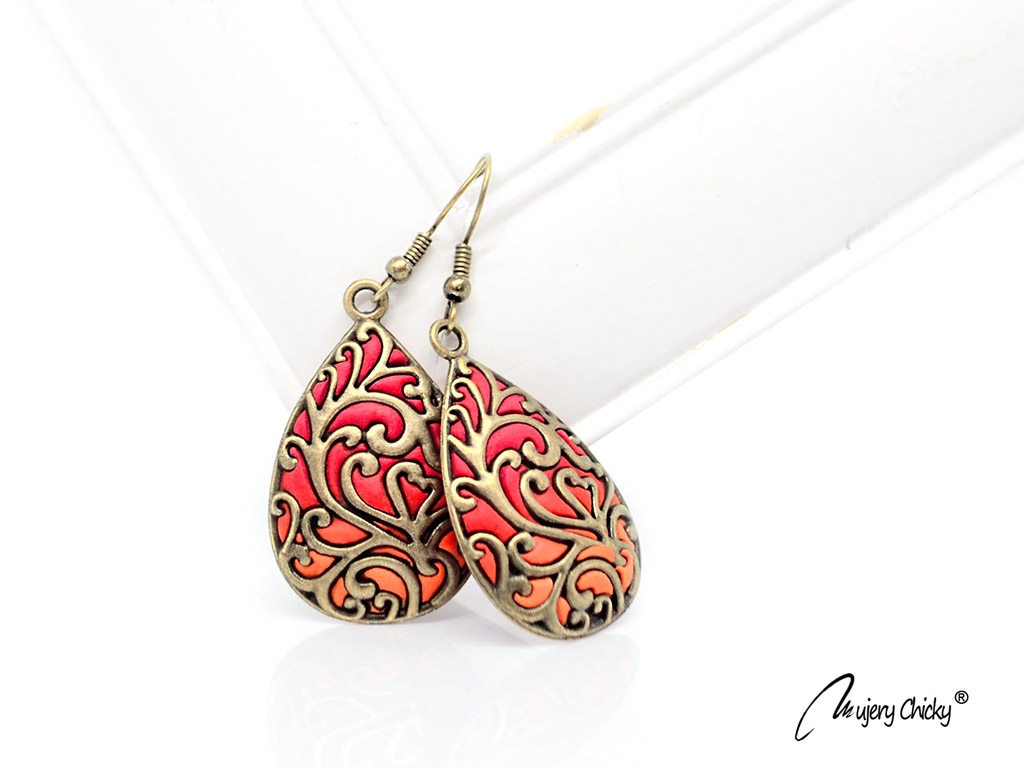 Cerceii Lumis - Indian Red în formă de lacrimă în stil vintage, lucrați manual prin tehnica applique, din lut polimeric, pe bază metalică cu finisaj bronz antichizat.