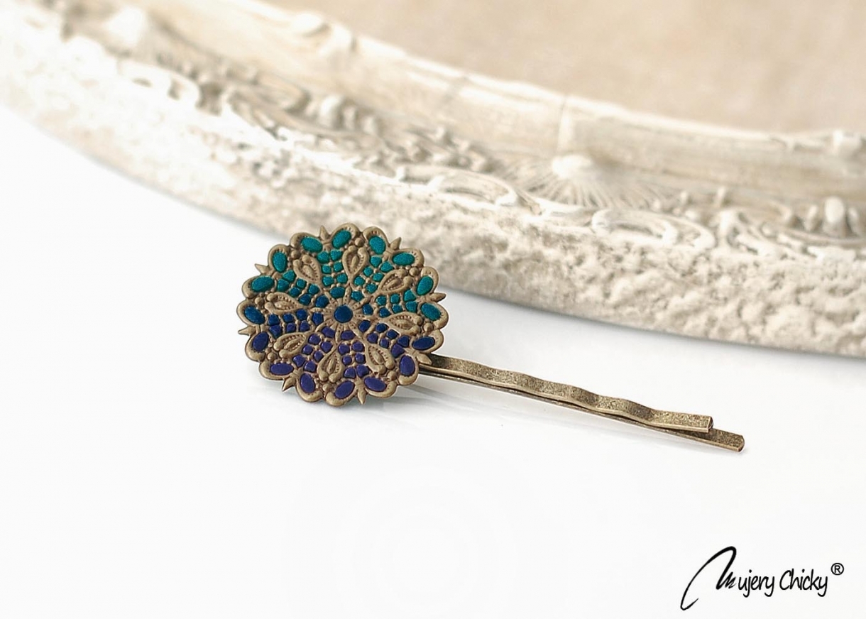 Agrafa Vintage este confecționată manual prin tehnica applique, din lut polimeric, pe bază metalică cu finisaj bronz antichizat. Degradeul cromatic este realizat prin modelaj.