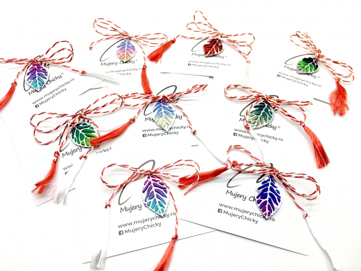 Mărțișoare Frunză Pandante lucrate manual, din lut polimeric și bronz sau aliaj metalic prin tehnica applique.