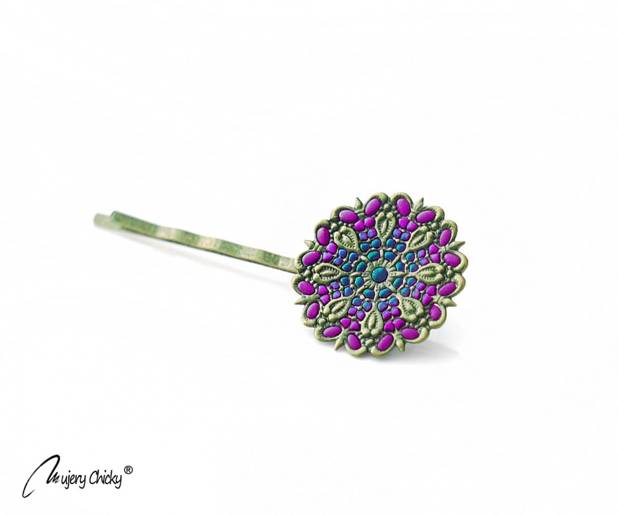 Agrafa Vintage este confecționată manual prin tehnica applique, din lut polimeric, pe bază metalică cu finisaj bronz antichizat. Degradeul cromatic este realizat prin modelaj.