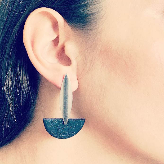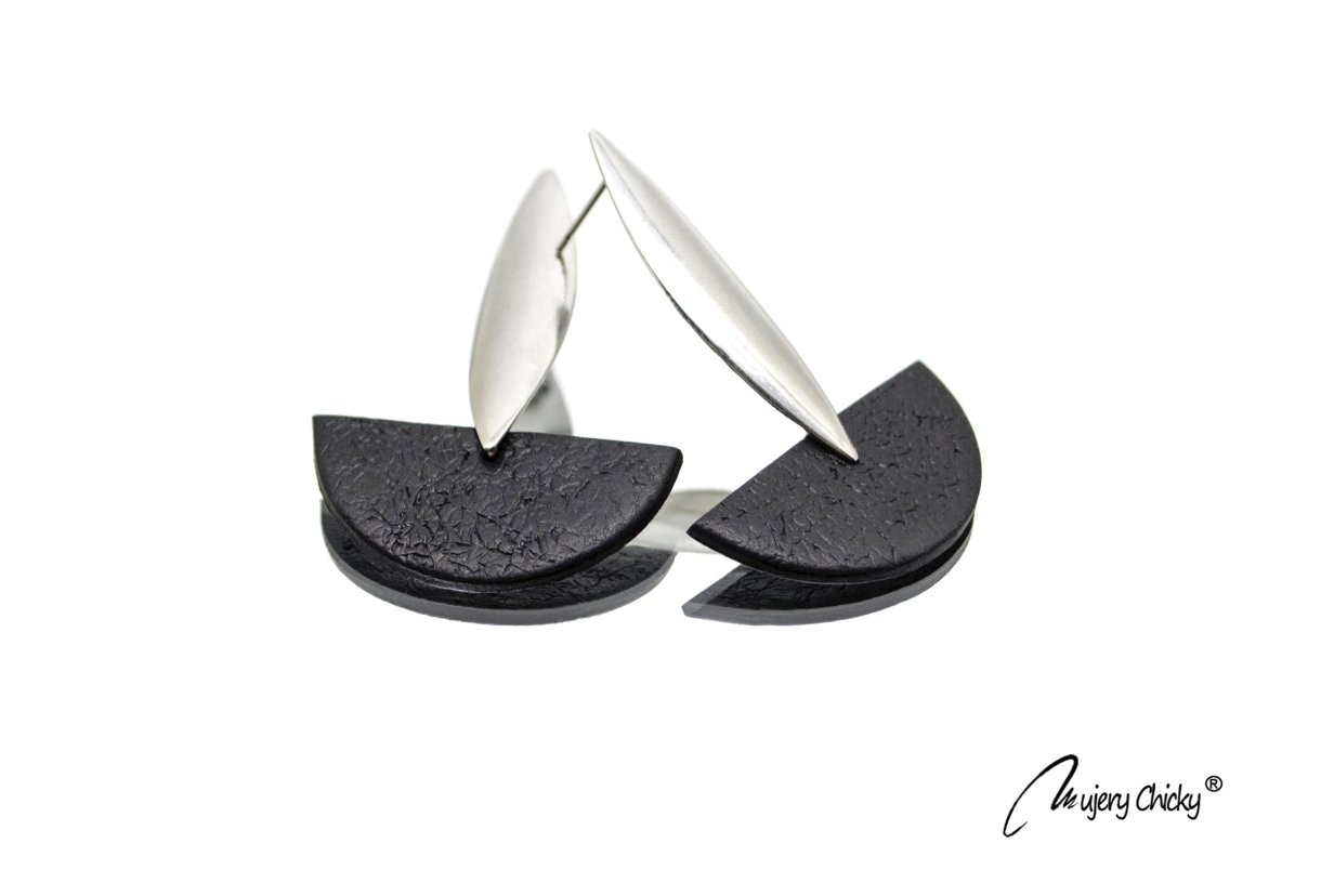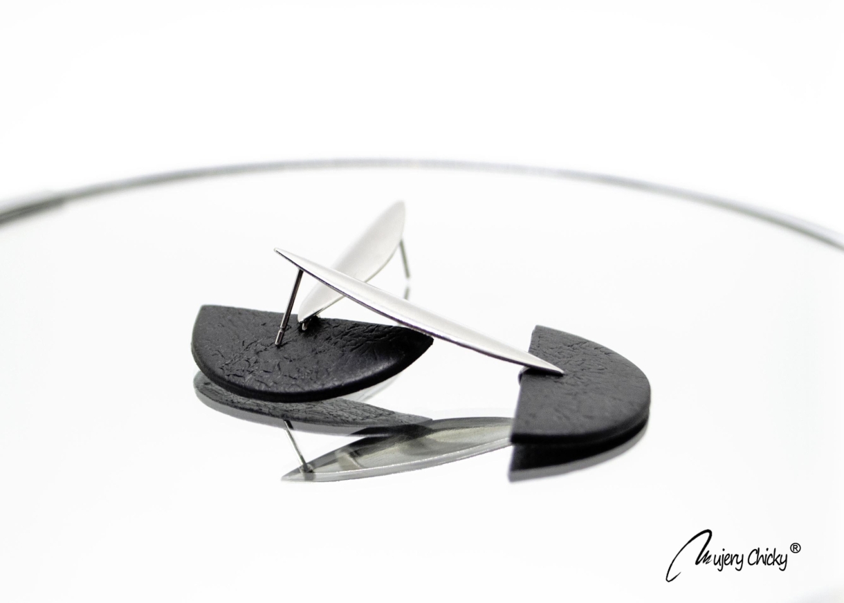 Cerceii geometrici asimetrici Veda fac parte din Colecția Underground, sunt lucrați manual din lut polimeric texturat cu aspect de piele și oțel inoxidabil.