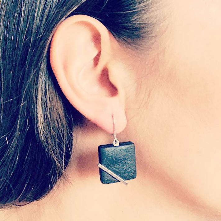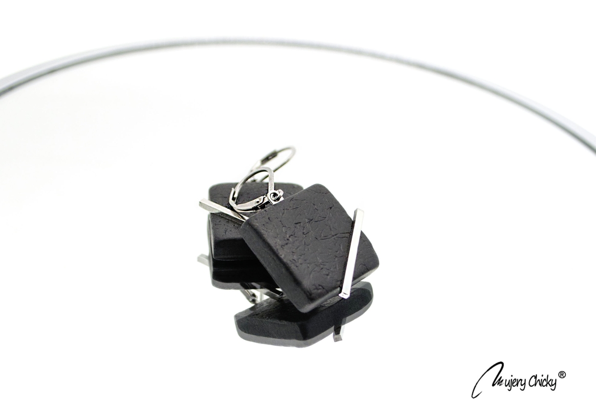 Cerceii geometrici asimetrici Ava fac parte din Colecția Underground, sunt lucrați manual din lut polimeric texturat cu aspect de piele și oțel inoxidabil.