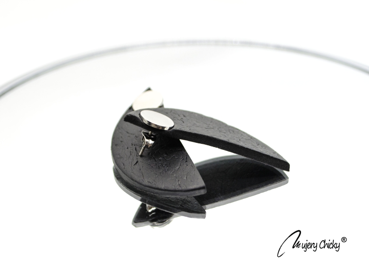 Cerceii geometrici asimetrici Adnana fac parte din Colecția Underground, sunt lucrați manual din lut polimeric texturat cu aspect de piele și oțel inoxidabil.