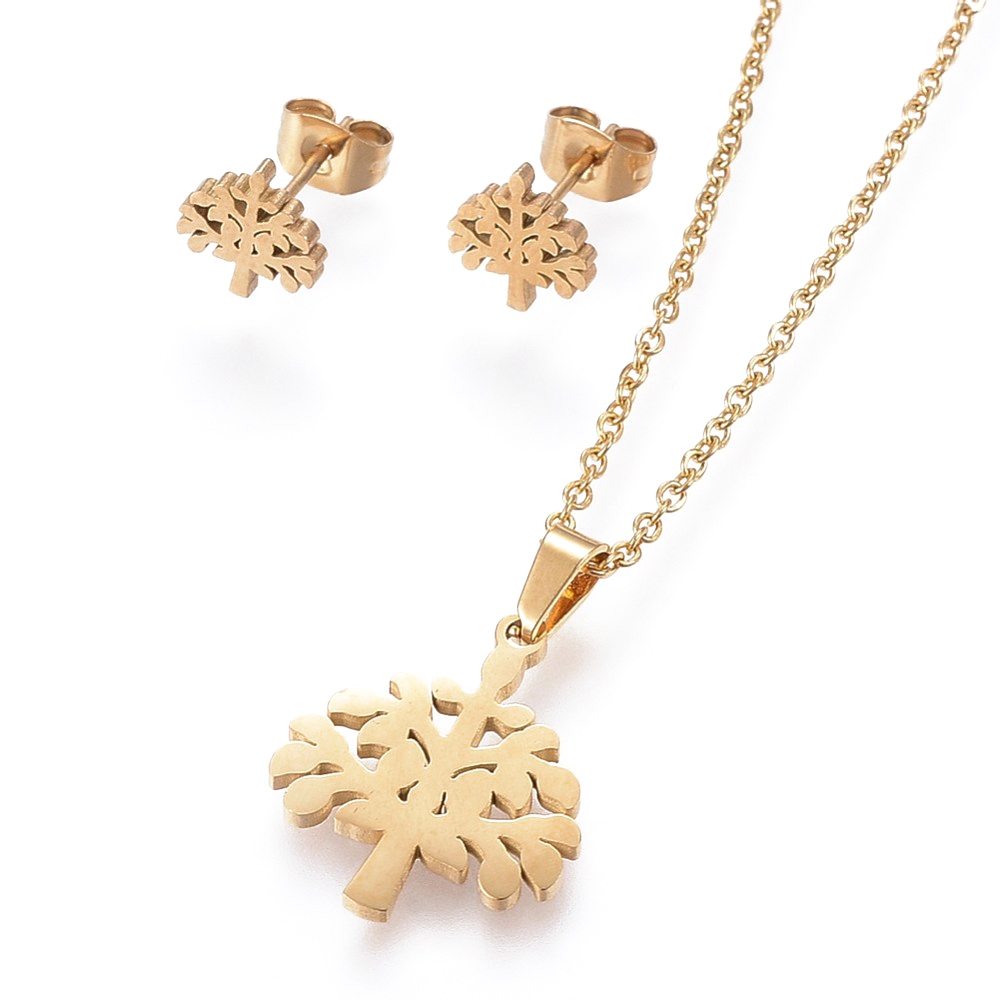 Setul Cercei și Colier Tree este confecționat integral din oțel inoxidabil electroplacat cu auriu, material nonalergic. Poate fi asortat cu ușurință la o cămașă albă și o pereche de jeansi sau la o rochie simplă de seară.