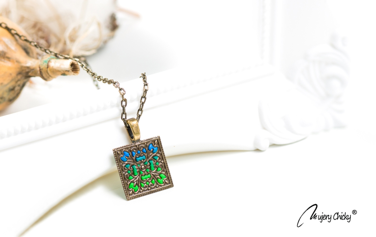 Colierul Ideas pătrat este lucrat manual prin tehnica applique, din lut polimeric, pe bază metalică cu finisaj bronz antichizat. Degradeul cromatic este realializat prin modelaj.