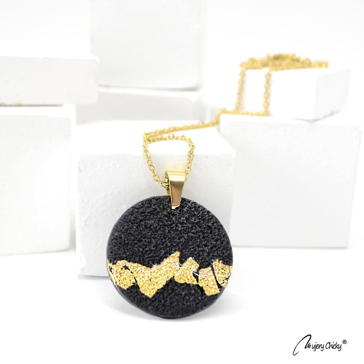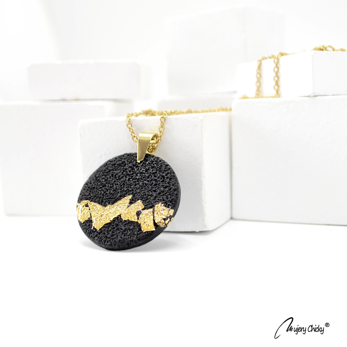 Colier geometric Esra face parte din Colecția Underground, este lucrat manual din lut polimeric texturat cu aspect de piele, placat cu foiță de aur sigilată cu rășină UV, montură cu oțel inoxidabil electroplacat cu auriu.