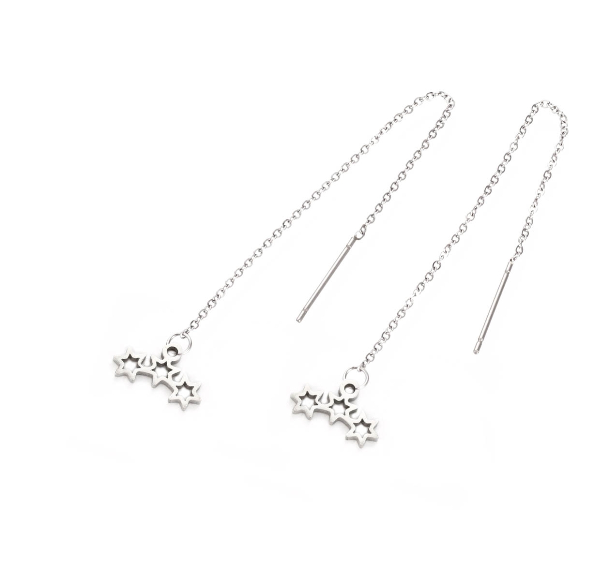 Cerceii asimetrici Lanțișor Trei Stele fac parte din Colecția Minimal, sunt o pereche de cercei populari, simpli și de efect, confecționați din oțel inoxidabil.