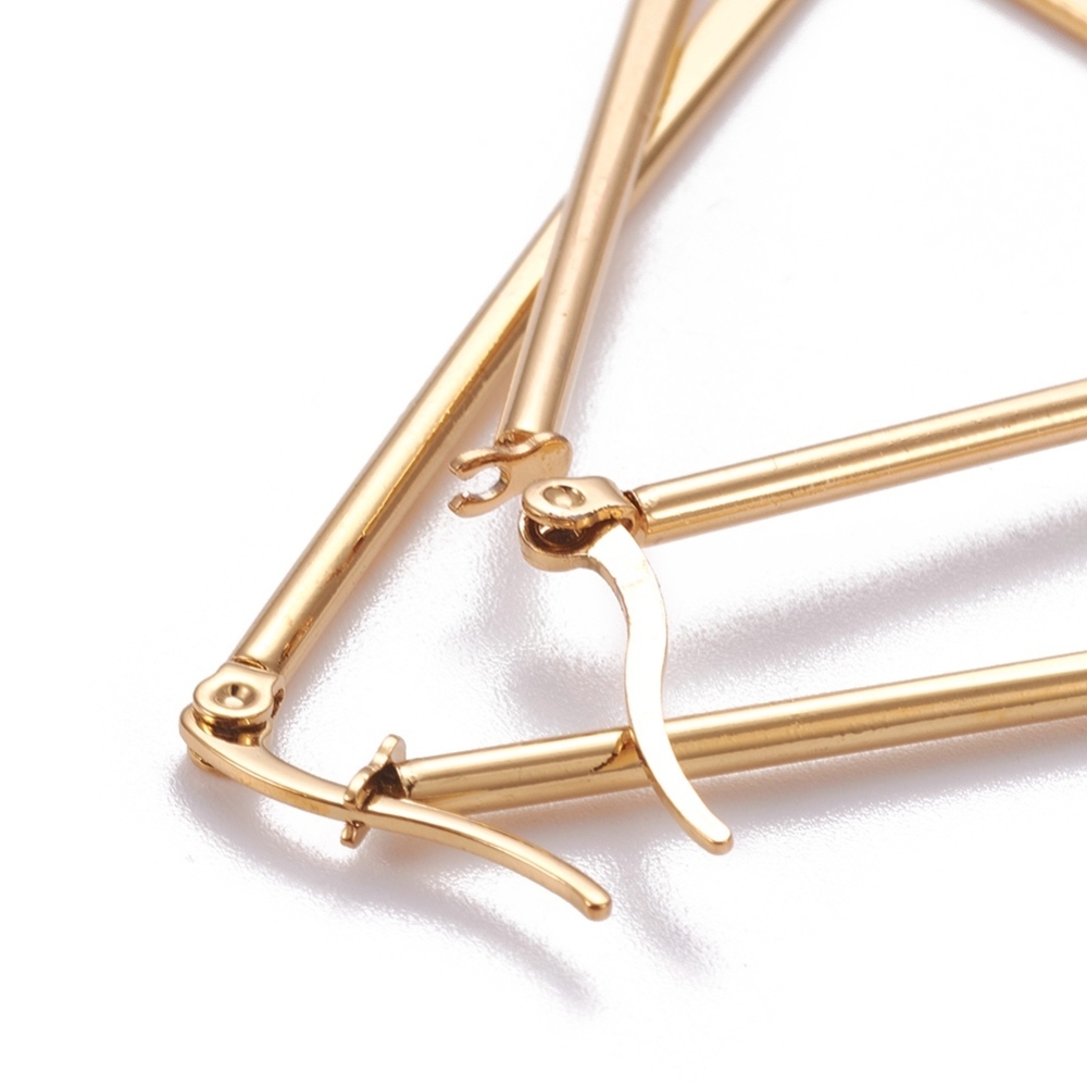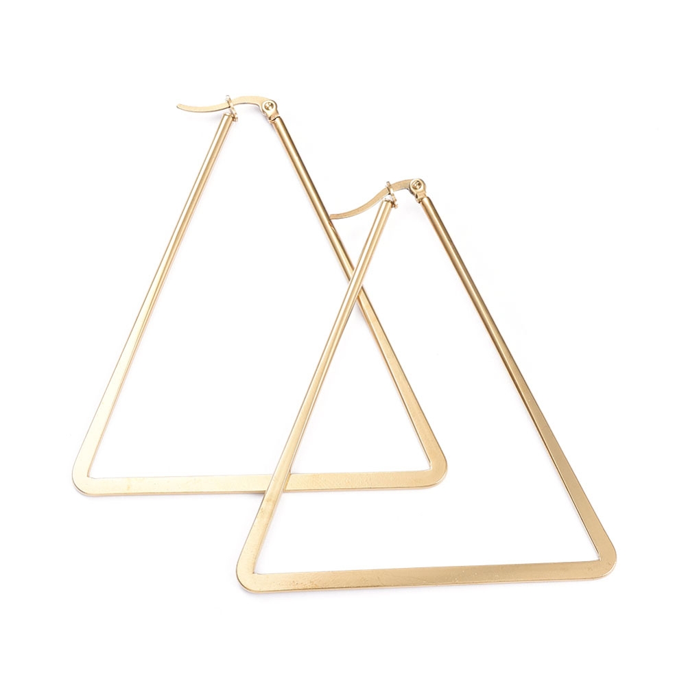Cerceii Hoop Triangle Auriu fac parte din Colecția Minimal, sunt o pereche de cercei populari, simpli și de efect, confecționați din oțel inoxidabil electroplacat cu auriu.
