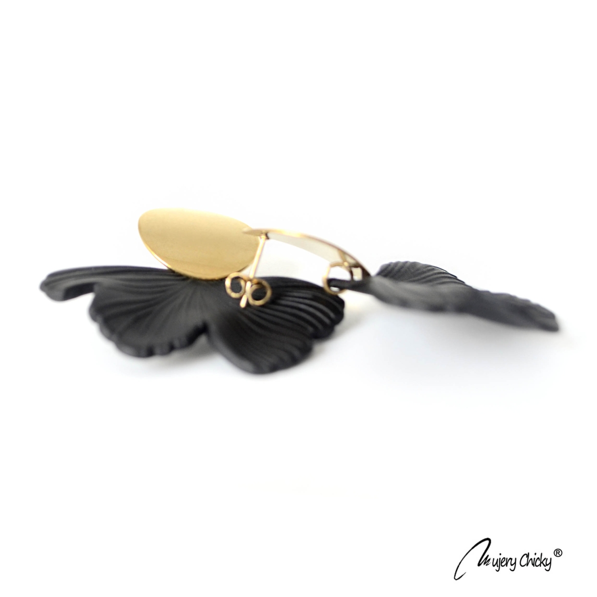 Cerceii Ginkgo Auriu fac parte din Colecția Underground, sunt lucrați manual din lut polimeric texturat și oțel inoxidabil electroplacat cu auriu.