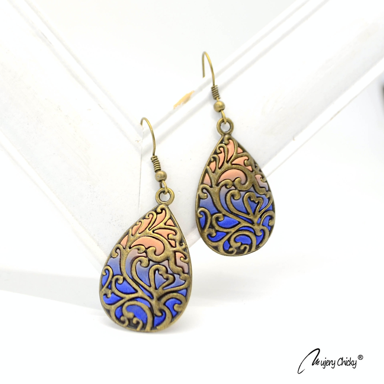 Cerceii Lumis - Pale Sunset în formă de lacrimă în stil vintage, lucrați manual prin tehnica applique, din lut polimeric, pe bază metalică cu finisaj bronz antichizat.