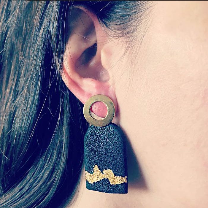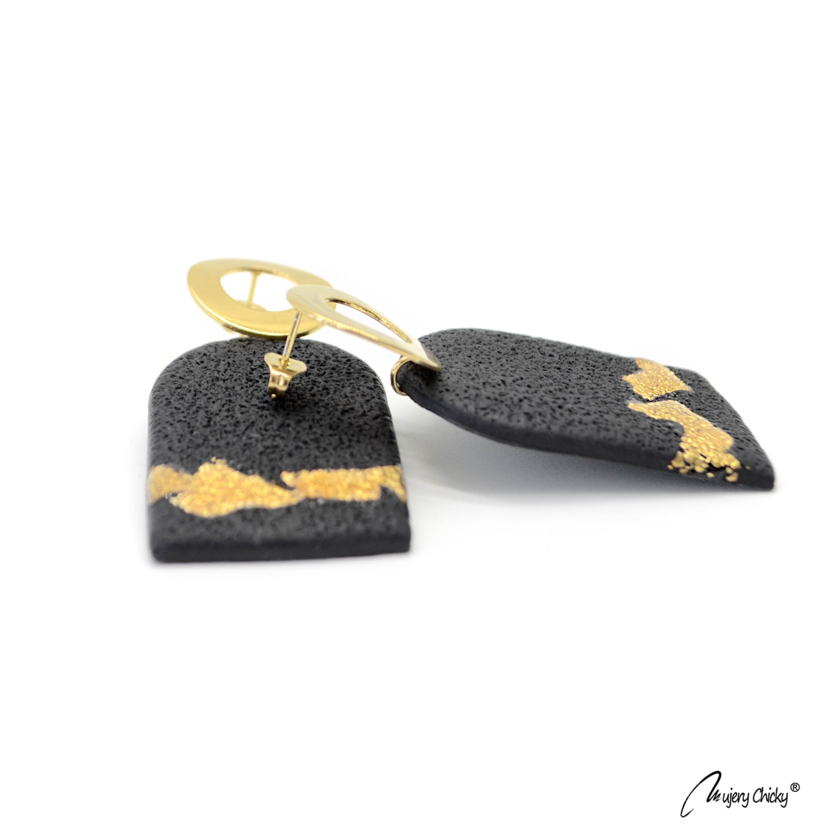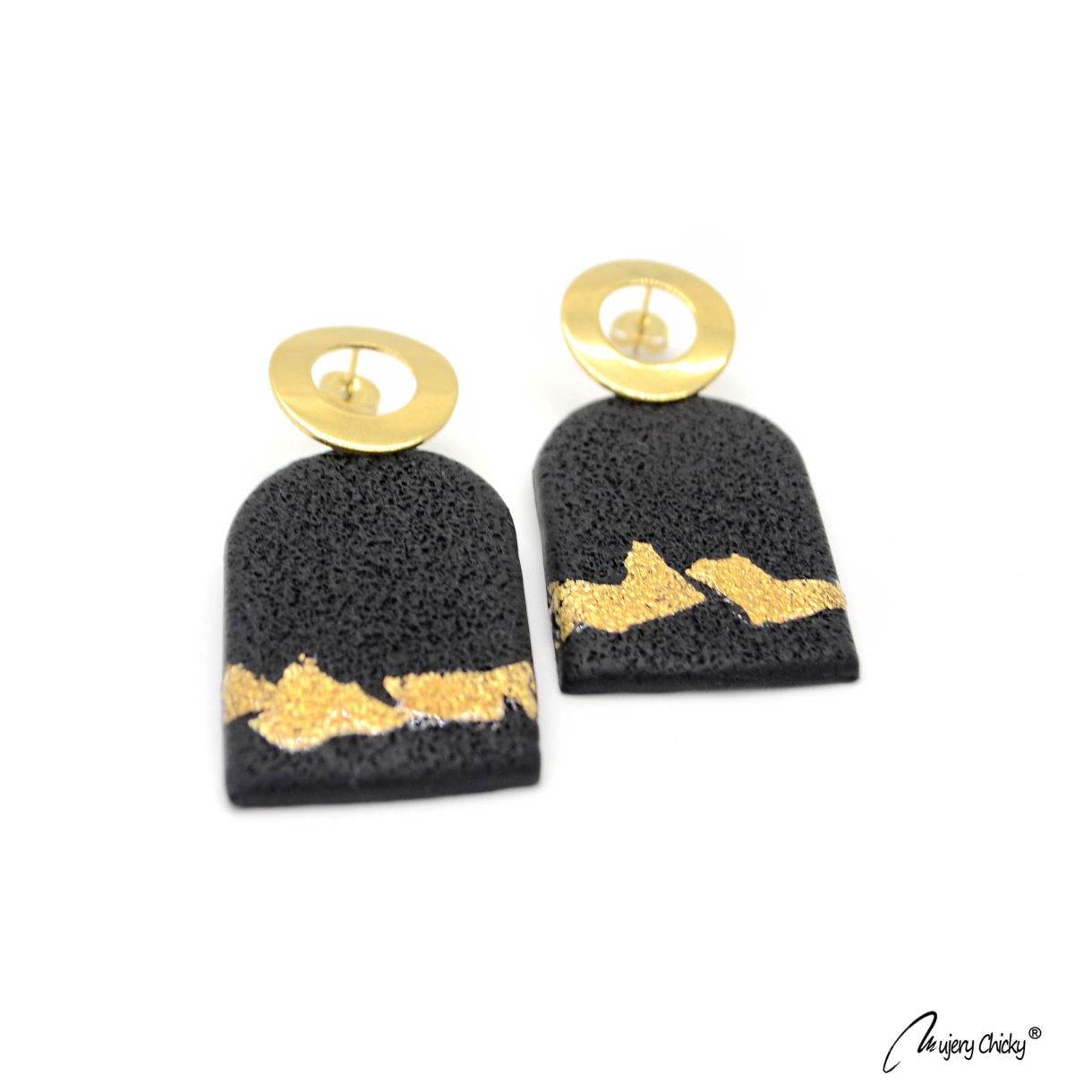 Cerceii Sheryn Auriu fac parte din Colecția Underground, sunt lucrați manual din lut polimeric texturat cu aspect de piele, placat cu foiță de aur sigilată cu rășină UV, montură cu oțel inoxidabil electroplacat cu auriu.