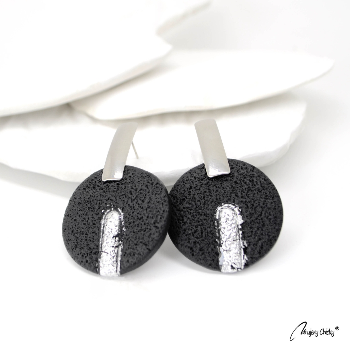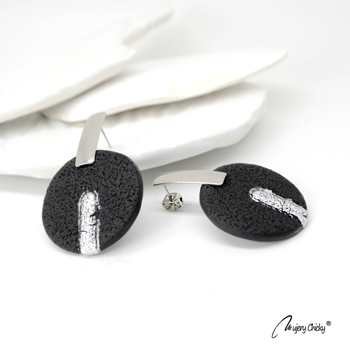 Cerceii Noira fac parte din Colecția Underground, sunt lucrați manual din lut polimeric texturat cu aspect de piele, placat cu foiță de argint sigilată cu rășină UV, montură cu oțel inoxidabil.