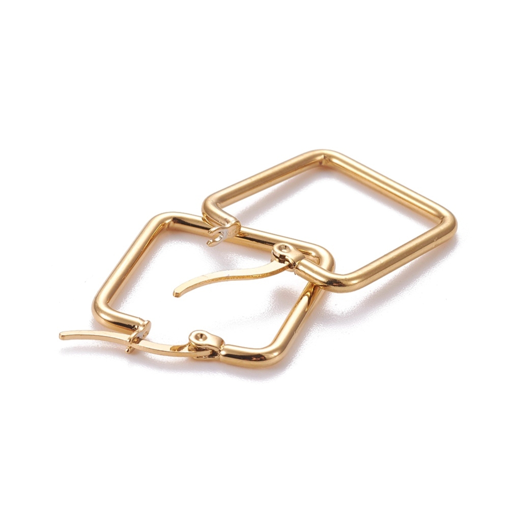 Cerceii Hoop Pătrat Auriu arată uimitor, sunt o alegere zilnică excelentă. Fac parte din Colecția Minimal, sunt o pereche de cercei populari, simpli și de efect, confecționați din oțel inoxidabil electroplacat cu auriu.