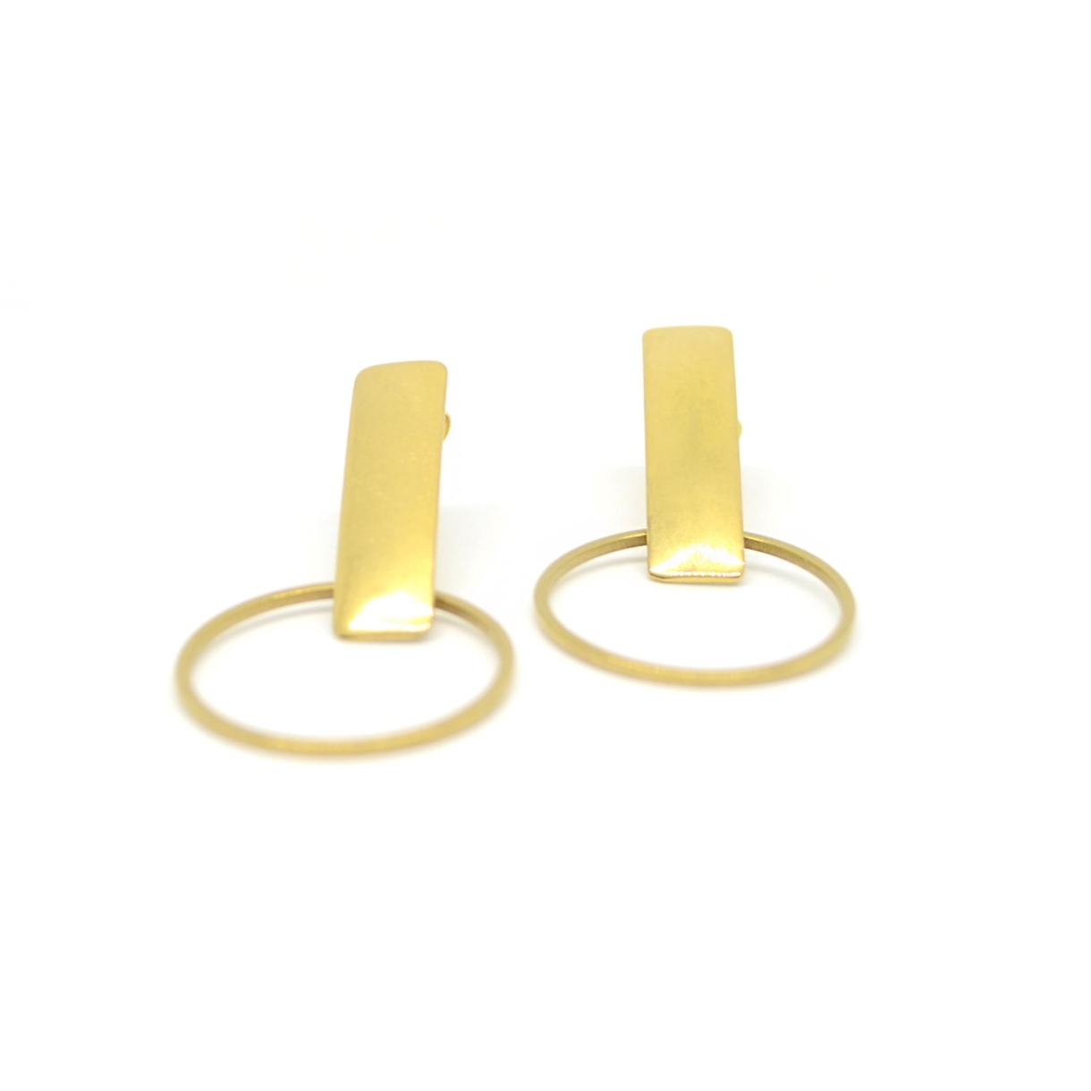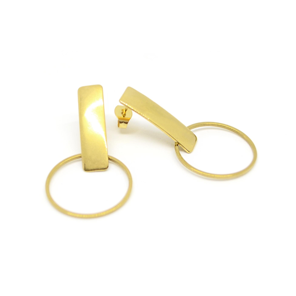 Cerceii geometrici Out fac parte din Colecția Minimal, sunt o pereche de cercei populari, simpli și de efect, confecționați din oțel inoxidabil, electroplacat cu auriu.