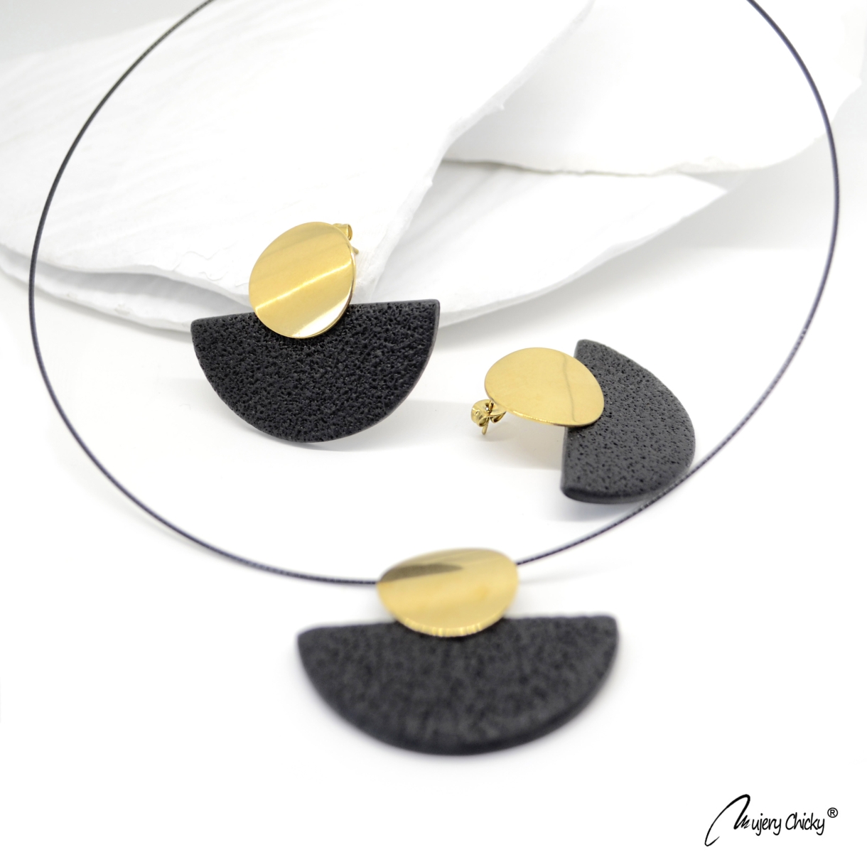 Setul Daruka Auriu face parte din Colecția Underground, este confecționat manual din lut polimeric texturat cu aspect de piele, montat pe bază metalică din oțel inoxidabil, electroplacat cu auriu.