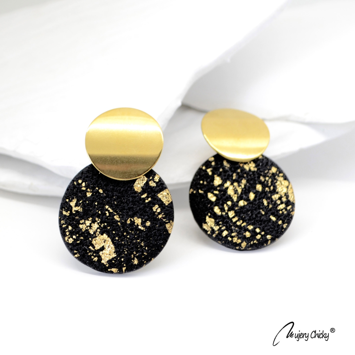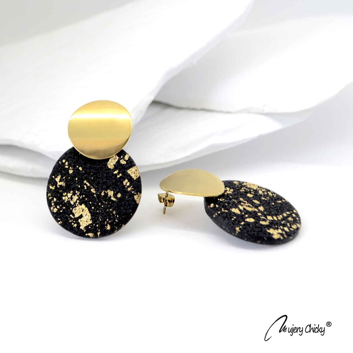 Cerceii Zenit Black fac parte din Colecția Underground, sunt lucrați manual din lut polimeric texturat cu inserții de foiță de aur, montură cu oțel inoxidabil electroplacat cu auriu.