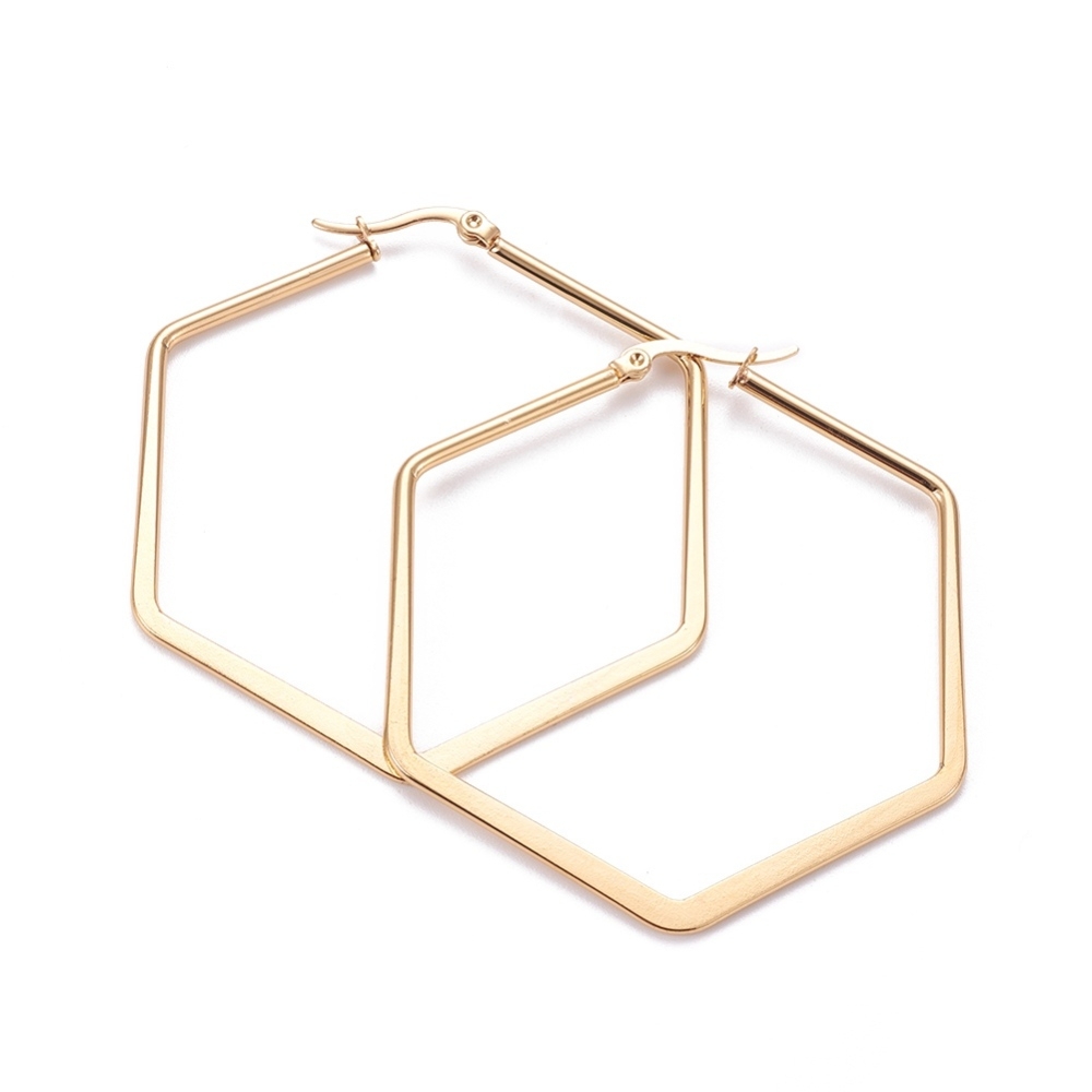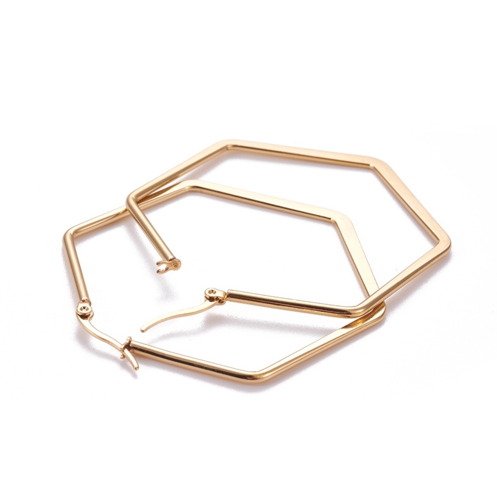 Cerceii Hoop Hexagon fac parte din Colecția Minimal, sunt o pereche de cercei populari, simpli și de efect, confecționați din oțel inoxidabil electroplacat cu auriu.