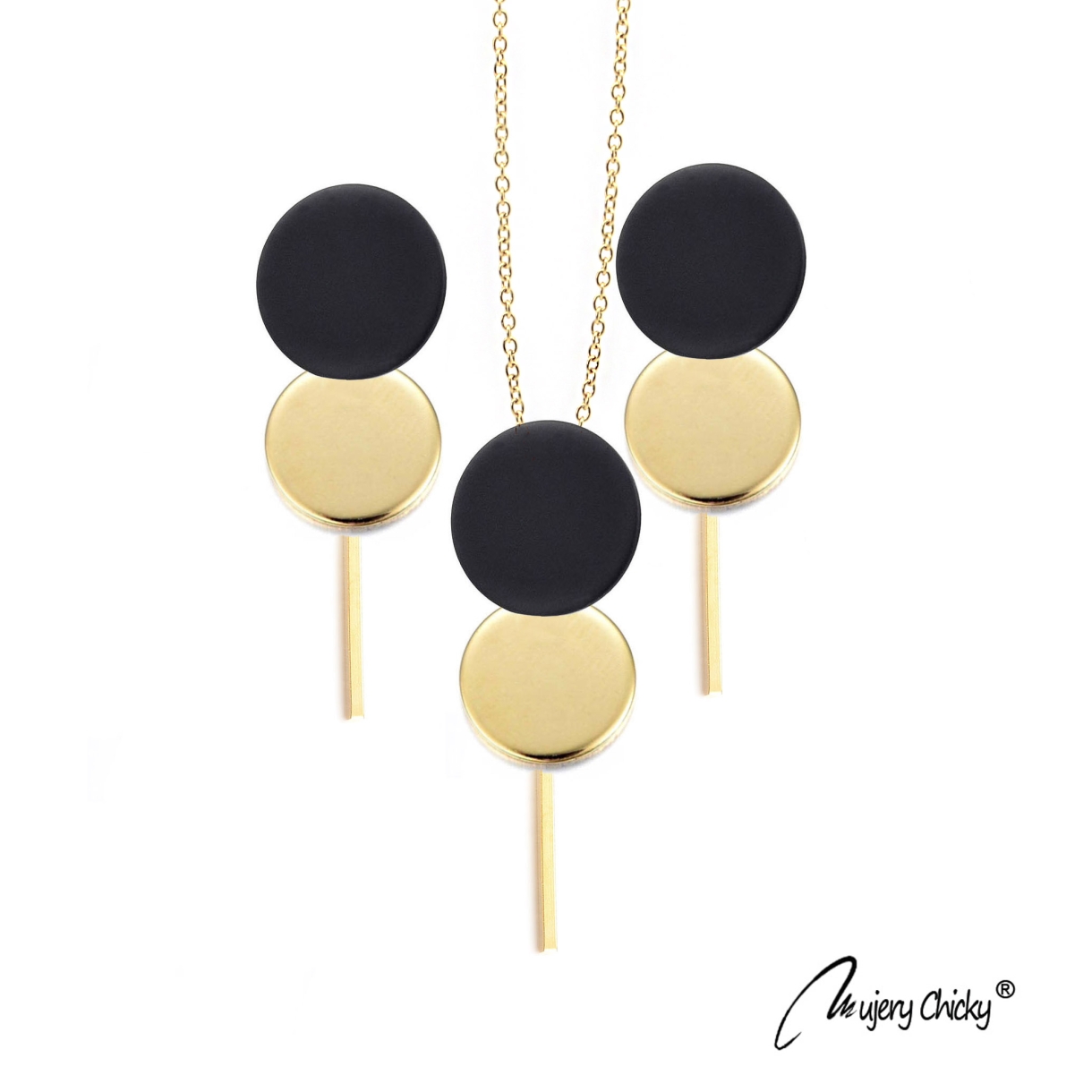 Setul Cercei si Colier Black Section Out este confecționat integral din oțel inoxidabil, electroplacat cu auriu, material nonalergic. Poate fi asortat cu ușurință la o cămașă albă și o pereche de jeansi sau la o rochie simplă de seară.