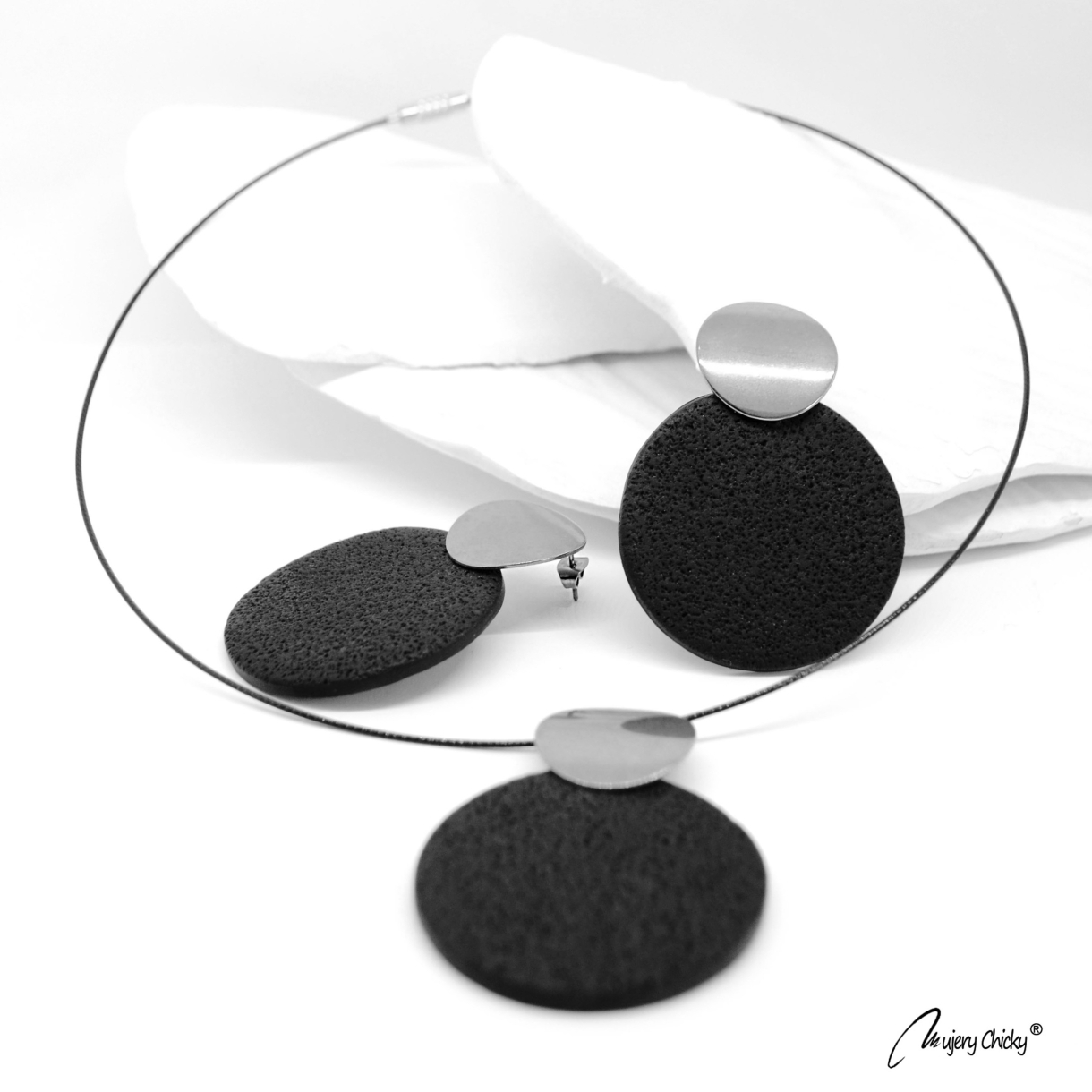 Setul Cabo Argintiu face parte din Colecția Underground, este confecționat manual din lut polimeric texturat cu aspect de piele, montat pe bază metalică din oțel inoxidabil, electroplacat cu auriu.