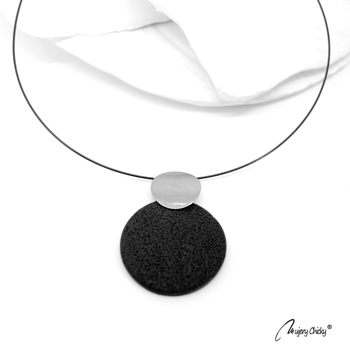 Colierul Cabo Argintiu face parte din Colecția Underground, este confecționat manual din lut polimeric texturat cu aspect de piele, montat pe bază metalică cu finisaj negru.